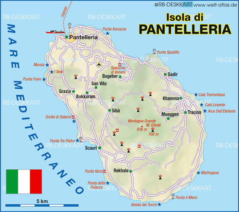 Scegliendo di utilizzare, per la visita della meravigliosa Pantelleria, una mappa turistica tra le più aggiornate che potrete trovare in loco, avrete modo di visualizzare i percorsi sterrati, i sentieri o le strade asfaltate. In questo modo potrete scegliere autonomamente che percorsi sfruttare per giungere alle spiagge attrezzate o ad altri punti di interesse quali vulcani, punti di ancoraggio e sbarco, sorgenti termali.